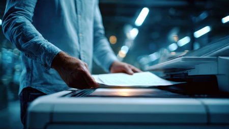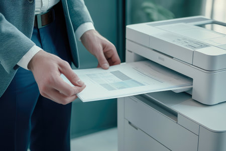 Office Worker Handling Documents at Printer in Modern Workspace.