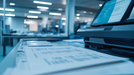 An elegant printer sits in a contemporary office, surrounded by neatly stacked printed papers and vibrant green plants, enhancing the workspace's productivity.