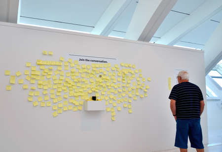 A woman stands in front of a large wall filled with colorful sticky notes in an art space. She appears deep in thought while examining the notes.