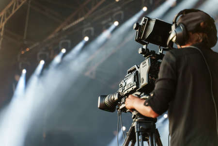 Professional digital video camera technician. Videographer with equipment at event.