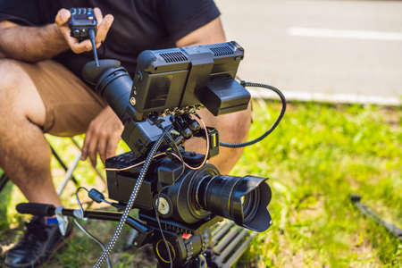 MOSCOW, RUSSIA - JULY 13, 2020. Man operating RED DRAGON professional cinema camera mounted on a tripod