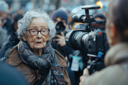 A close-up of a cameraman filming a protest, using a high-quality digital camera on a tripod, documenting the powerful moment in a crowded protest setting
