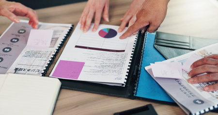 Hands, business and people with documents in office of finance report, investment chart and application. Staff, paperwork and explain proposal, profit growth and financial contract of budget in Japan