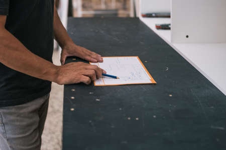 Man examining the information of a paper with measurements of a furniture in a workshop