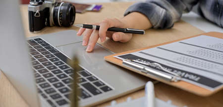 Close up view of worktable with laptop, camera, books and copy space in home office, clipping path
