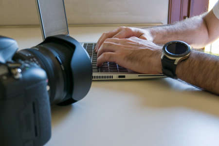 Photo journalism. Laptop, camera, tablet, note, camera lens.