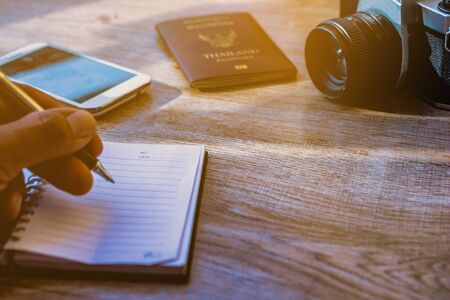 Hand holding a pen and notebook. Men are writing recorded on notebook a daily basis. Camera Phones and Accessories on old wood.