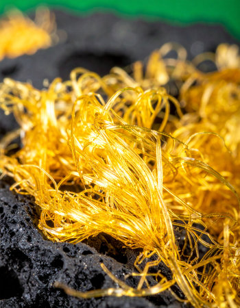 Close up view of golden threads on black volcanic sand. Shallow depth of field.