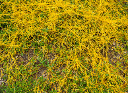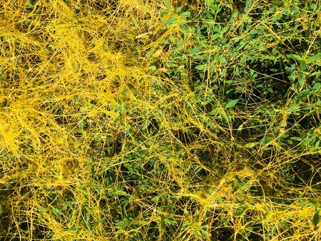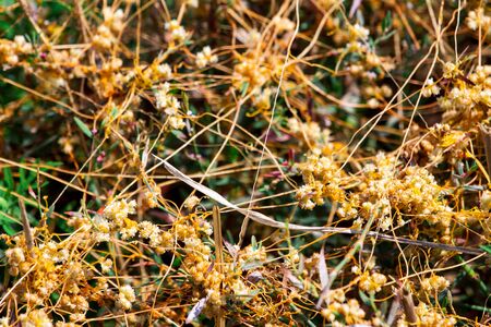 Amar bail or dodder (Cuscuta) - yellow parasitic plant without leaves. Cuscuta is a commonly used in traditional Chinese medicine. on green grass, racemosa, cipó-chumbo, yellow filaments