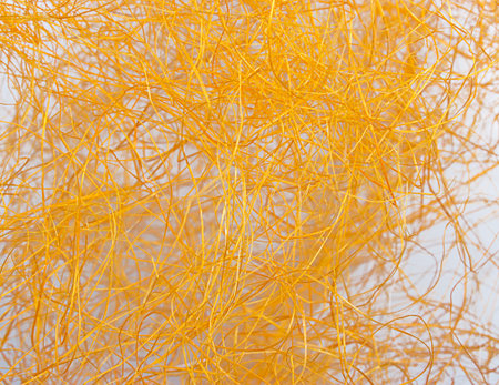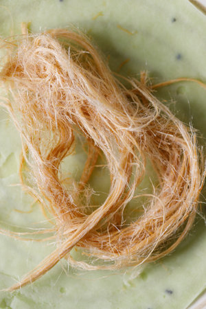 A close-up shot of Fios de Ovos, a traditional Portuguese and Thai dessert made from egg yolks, sugar, and water, arranged in a delicate golden nest on a clean white surface.
