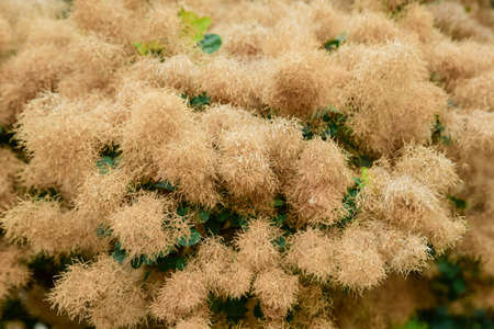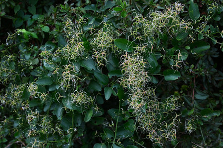 Sweet autumn clematis (Clematis terniflora) after flowering. Ranunculaceae, semi-shrub vine. After the white flowers (calyx) bloom, reddish-brown achenes form.