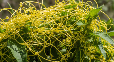 A tangled mass of yellow, spaghetti-like dodder vine (Cuscuta), a parasitic plant, envelops a green host plant. This image illustrates parasitism in nature, showing how the leafless vine extracts nutrients from its host.