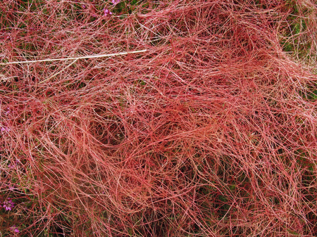 Cuscuta(Dodder)is a genus of over 200 species of yellow, orange,or red  parasitic plants.Dodder can be identified by its thin stems appearing leafless,with the leaves reduced to minute scales. Amarbel