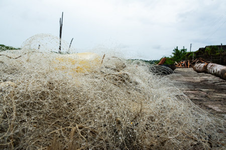 Dried vetiver roots displayed on a bright white backdrop, detailed close-up showing fibrous texture and earthy aesthetic