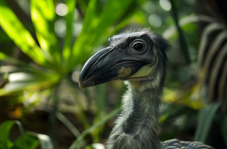 A captivating close-up of a dodo bird, showcasing its distinctive beak and textured plumage amidst dense tropical foliage