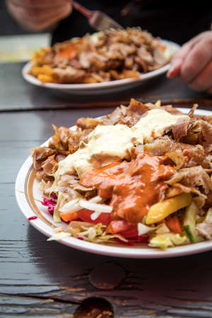 German Döner Kebab dish with veal meat, french fries, salad, hot sauce and garlic sauce on wooden table