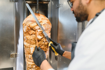 Professional chef skillfully slicing delicious shawarma meat from a rotating spit in a commercial kitchen, preparing a popular street food dish