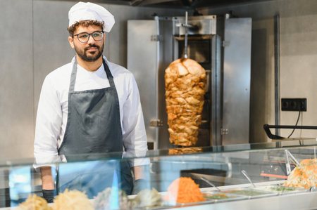 Middle eastern chef wearing black gloves and apron standing in front of a rotating shawarma spit in a modern fast food restaurant