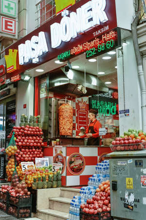 Istanbul, Turkey - October 6, 2019: Traditional turkish food Doner kebab in a street of Istanbul