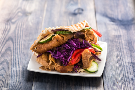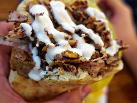Closeup of Doner Kebab Shawarma Gyros served in a Pitab bread typical Middle East Mediterranean street food