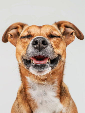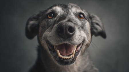 Close-up of a happy dog with brown eyes, gray and white fur, and an open mouth showing teeth. The dog's expression is joyful and friendly, captivating the viewer's attention