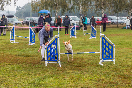 LYSA NAD LABEM, CZECH REPUBLIC - SEPTEMBER 28, 2020: Dog and a handler during agility competition in Lysa nad Labem, Czech Republic