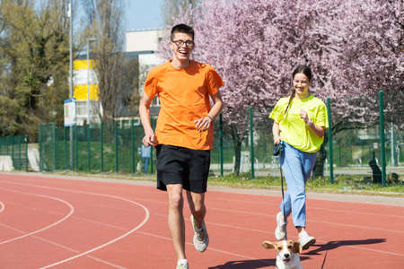 Young happy couple running on a athletic trail with a dog