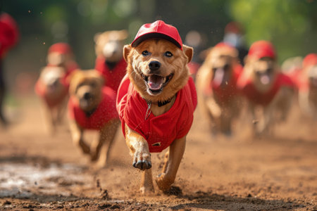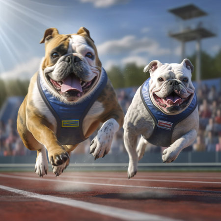 An AI generated illustration of two playful dogs racing on a sunny outdoor track, enjoying a carefree afternoon of fun and competition