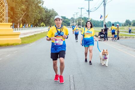 KANCHANABURI THAILAND - October 6 : Unidentified Thai woman with her dog run and take photography on the city road on October 6, 2019 in Kanchanaburi, Thailand