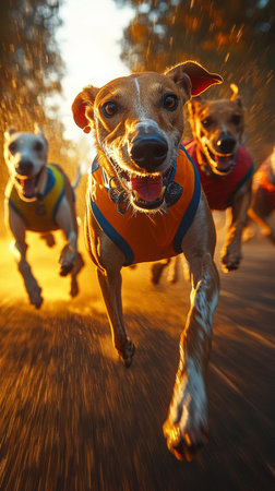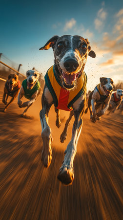 Greyhounds in Colorful Vests Chasing Victory, Professional Canine Race, Dynamic Action Shot