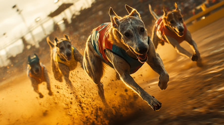 Greyhounds Racing on Track, Dynamic Action Shot with Motion Blur and Late Afternoon Sunlight.