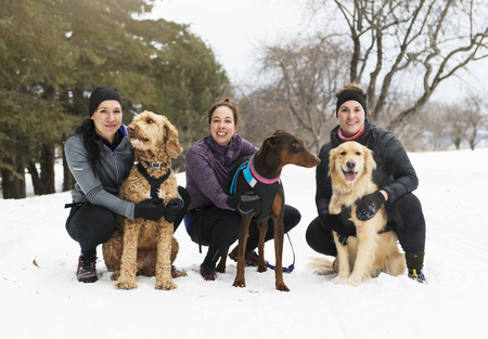Canicross woman group have fun in winter season