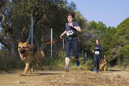 People participating in the Canicross Entrevinyes race, on February 9, 2020, in Alella, Barcelona, Spain.