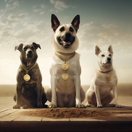 An AI generated illustration of three dogs sitting on a smooth wooden surface