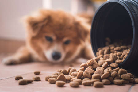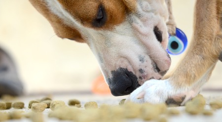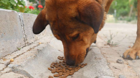 Hungry dog eating dry feed from food bowl. Pet feeding