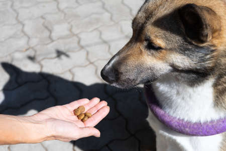 Encouragement of the dog after the command. The hostess gives a treat to the dog during training.