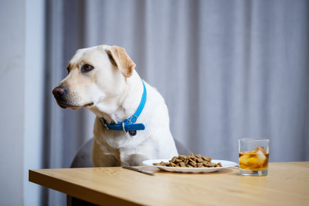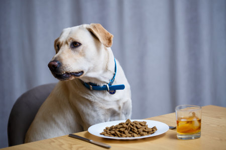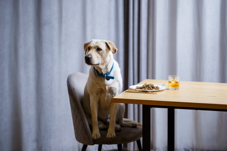 portrait of a business large dog of breed Labrador of light coat, sitting on a chair near the dining table, a plate with food, pets