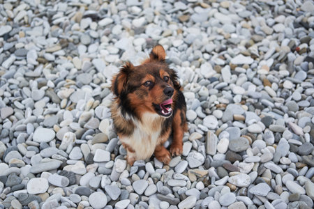 Charming red brown mongrel with white fluffy breast sits on beach on rocks and smiles. Cute little young half breed puppy on walk.
