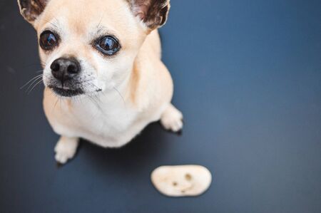 chihuahua dog trying to catch a treat or cookie in the air , with funny face expression, isolated on black background