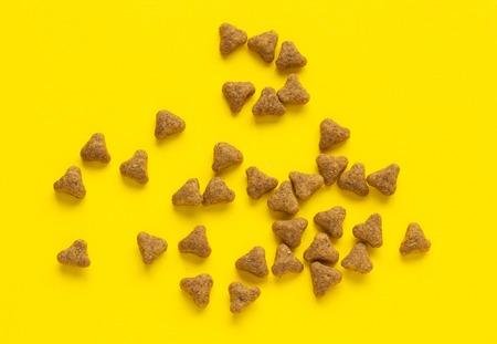 Dry cat food on a yellow background, space for text