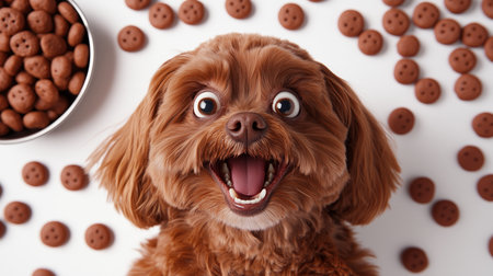 Brown dog making a funny face with a bowl and treats scattered on a white background