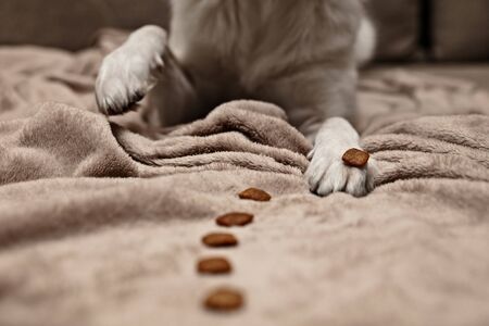 Dog´s paw and a dog treats line, obedient training and tricks with food or goodies