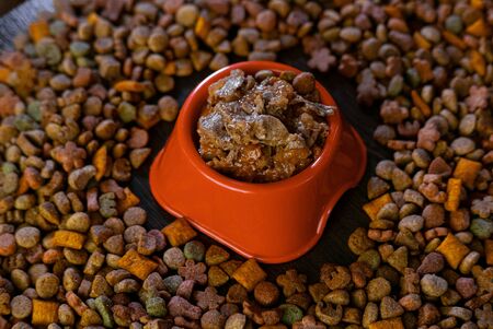 Wet pet food in a orange plastic bowl on black table.