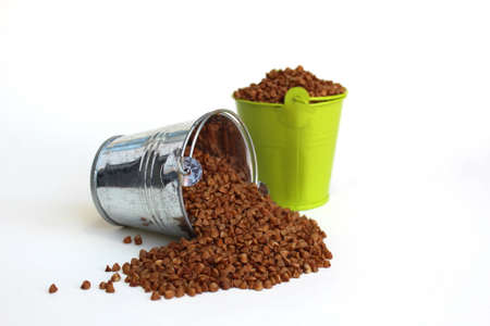 Two decorative buckwheat buckets on a white background