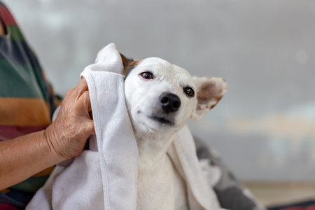 Old woman washing her dog with towel at home. Selective focus.