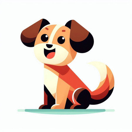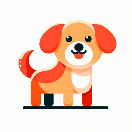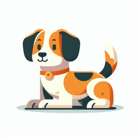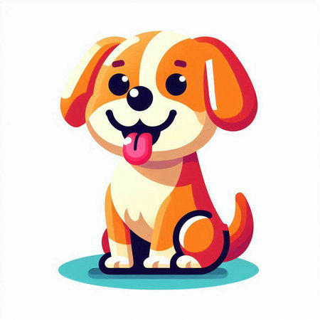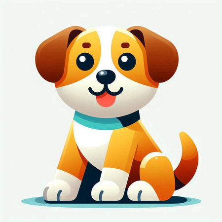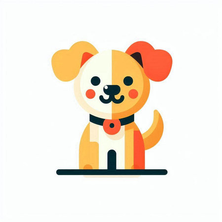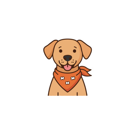 A cute cartoon dog is smiling, wearing an orange bandana with bone patterns. The graphic style is simple, modern and appealing to children and adults. This delightful illustration is perfect for