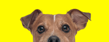 Portrait of a cute mixed breed dog looking at the camera on a yellow background