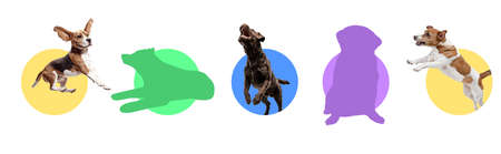 Cute funny active purebred dogs jumping isolated over colored background.
