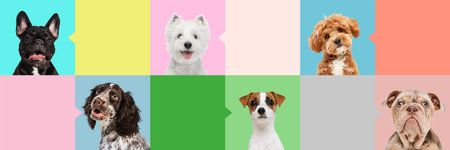 Banner. Set made of cheerful, playful pets, domestic purebred dogs with colorful speech bubbles with negative space for text. Concept of veterinary, grooming services for domestic animals. Ad