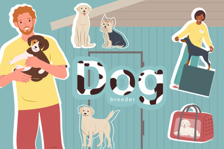 Dog breeder business collage with flat icons of animals with their human masters and pet carriers vector illustration